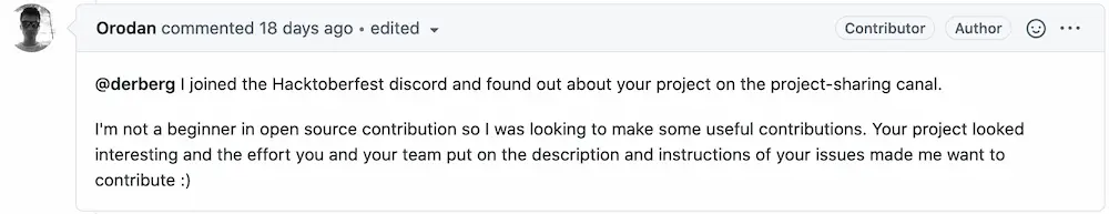 Last but not least, once a week, I advertised our project on the official Hacktoberfest Discord server.