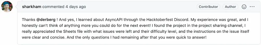 Let me conclude by saying that I hope the "harm to the open source made by DigitalOcean" is not as significant as the harm that such hate does to open source by discouraging new open-source contributors. However, this is just speculation. How can I consider any of these things harmful if I did not conduct scientific research? I can only confirm that Hacktoberfest did not harm AsyncAPI Initiative. On the contrary, it was pretty neat.